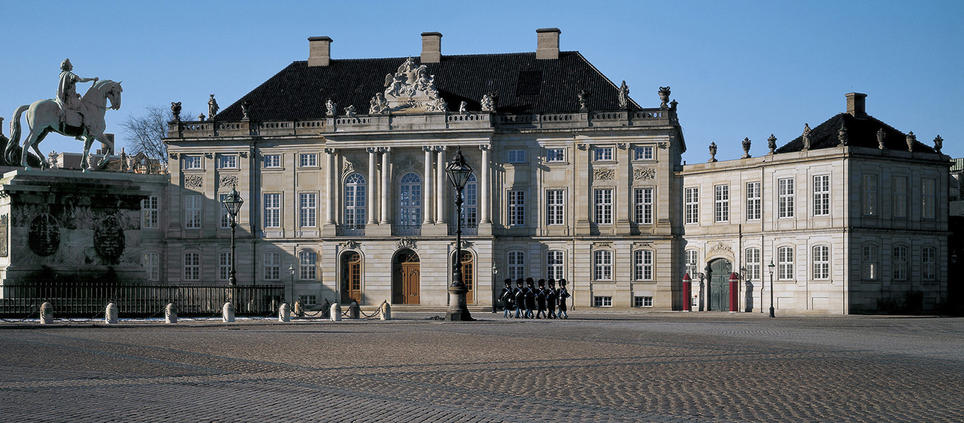 Amalienborg, som omgiver den smukke plads med rytterstatuen af Frederik V fra 1771, består af fire identiske palæer. Christian VII’s palæ (også kaldes Moltkes Palæ, gæstepalæ), Christian VIII's Palæ (også kaldet Levetzaus Palæ, gæstebolig for Prins Joachim og Prinsesse Benedikte), Christian IX's Palæ (dronningens bolig) og Frederik VIII's Palæ (også kaldet Brockdorffs Palæ, kronprinsefamilien bolig) – her finder du Amalienborg Museum.